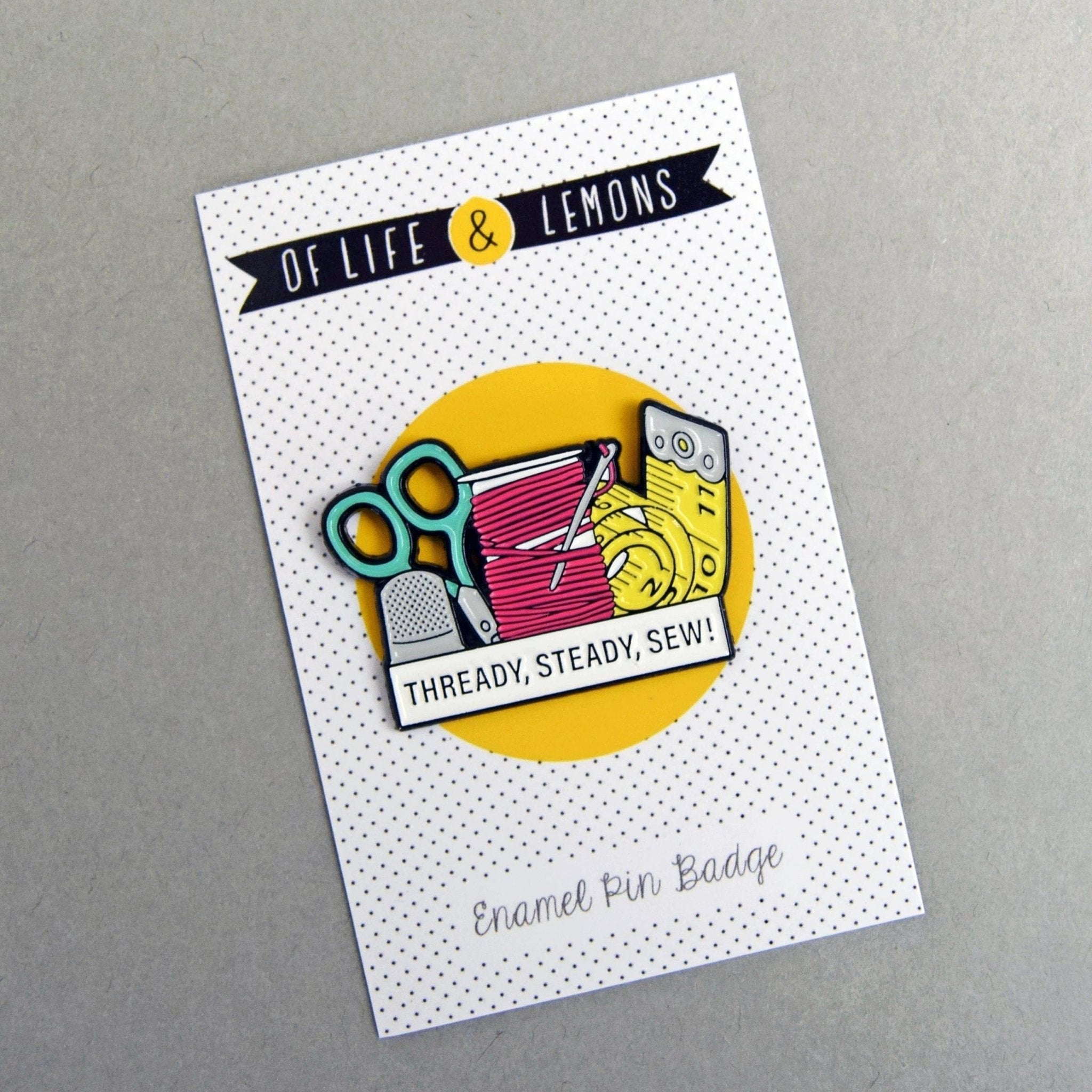 This lovely 'Thready, steady, sew!' enamel pin badge is ideal for someone who loves to sew!