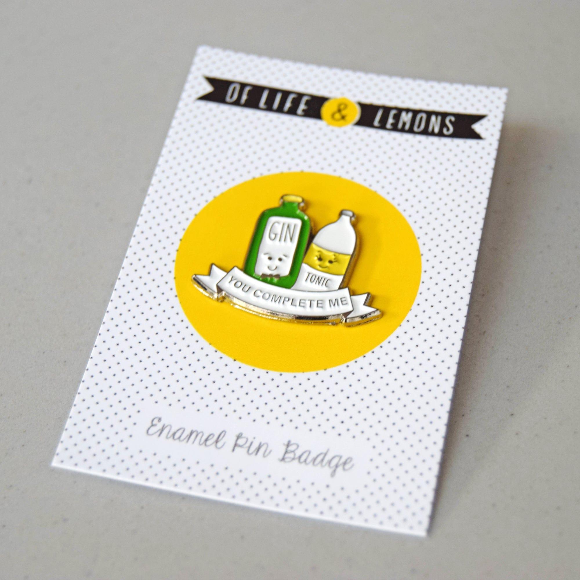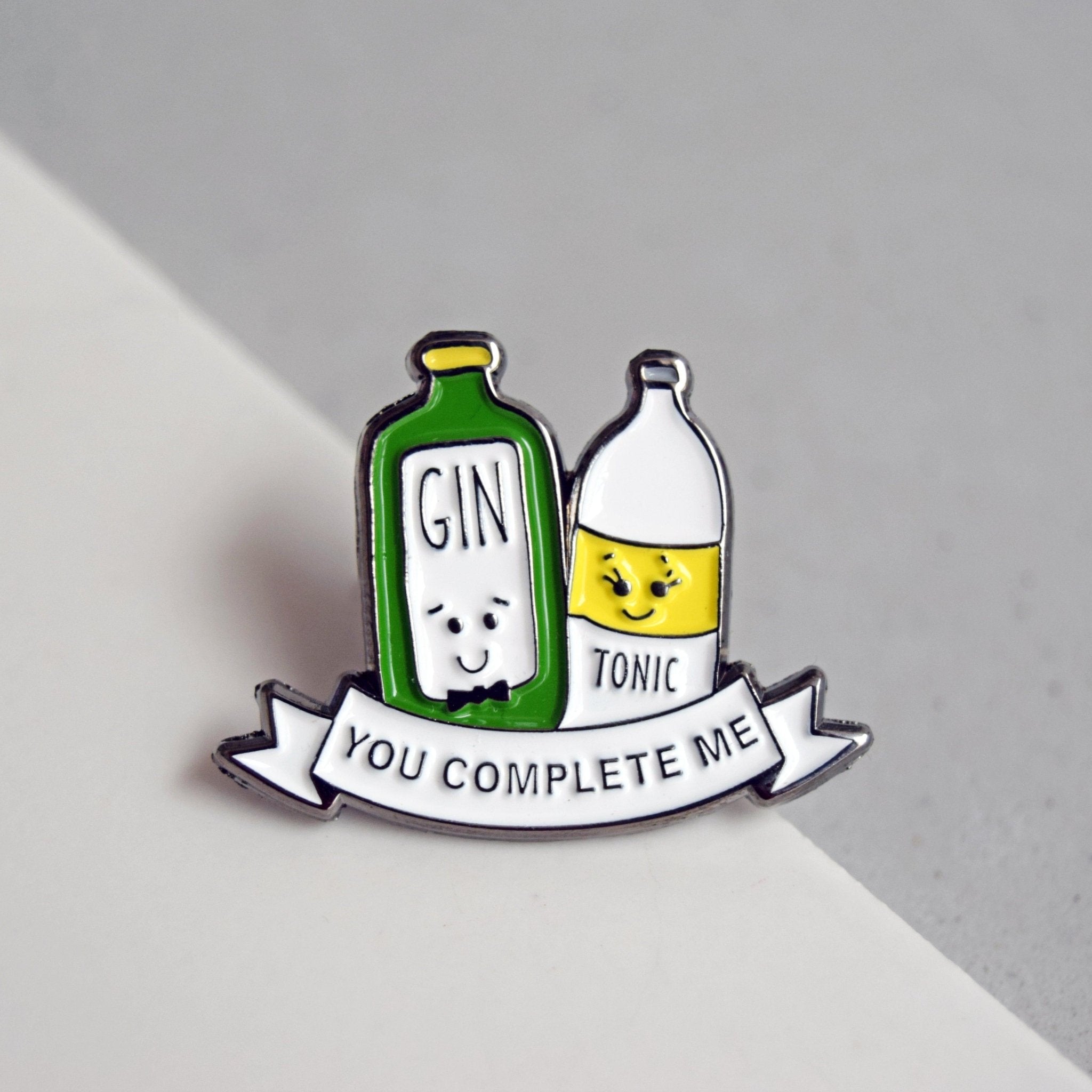 This humorous gin and tonic enamel pin badge features a cute illustration of two bottles, one gin and one tonic and the words 'You complete me'. If chocolates and roses aren't your thing, this gin pin badge would make an inspired gift for your gin enthusiast partner or simply a humorous gift for a friend.