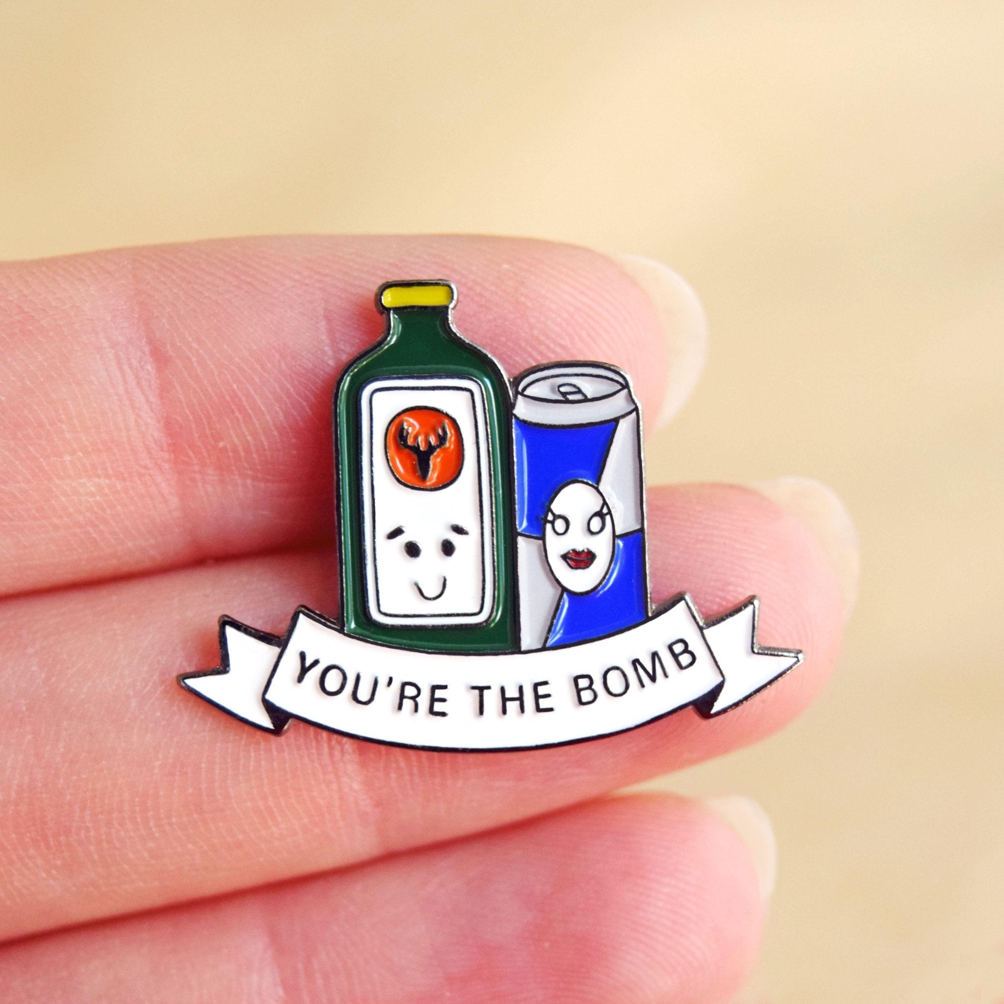 This cute 'You're the Bomb' enamel pin is the perfect gift for a friend or partner to show how much you rate them. Featuring illustrations of the ingredients of a Jagerbomb, this cheeky pin badge is a clever play the phrase.