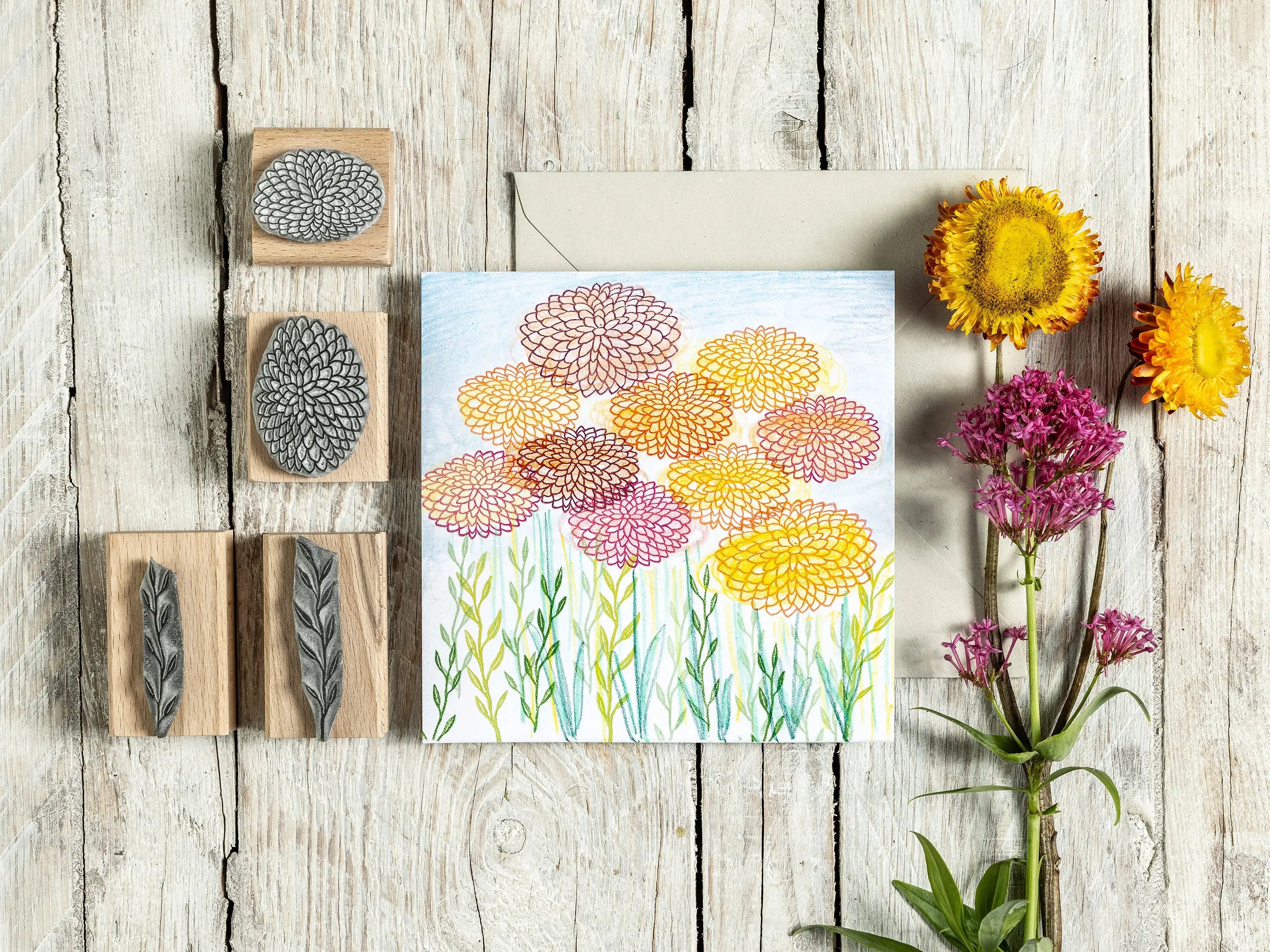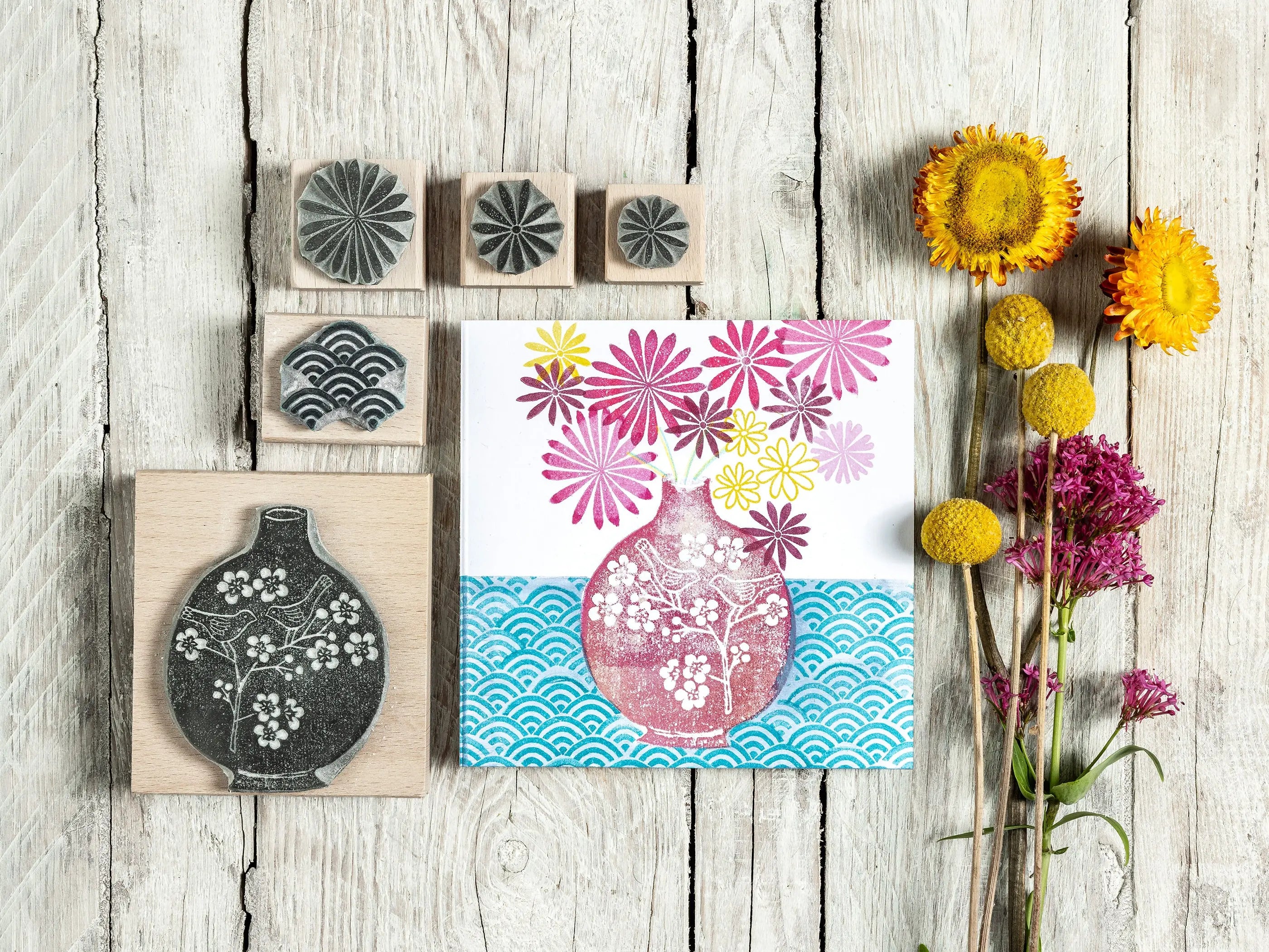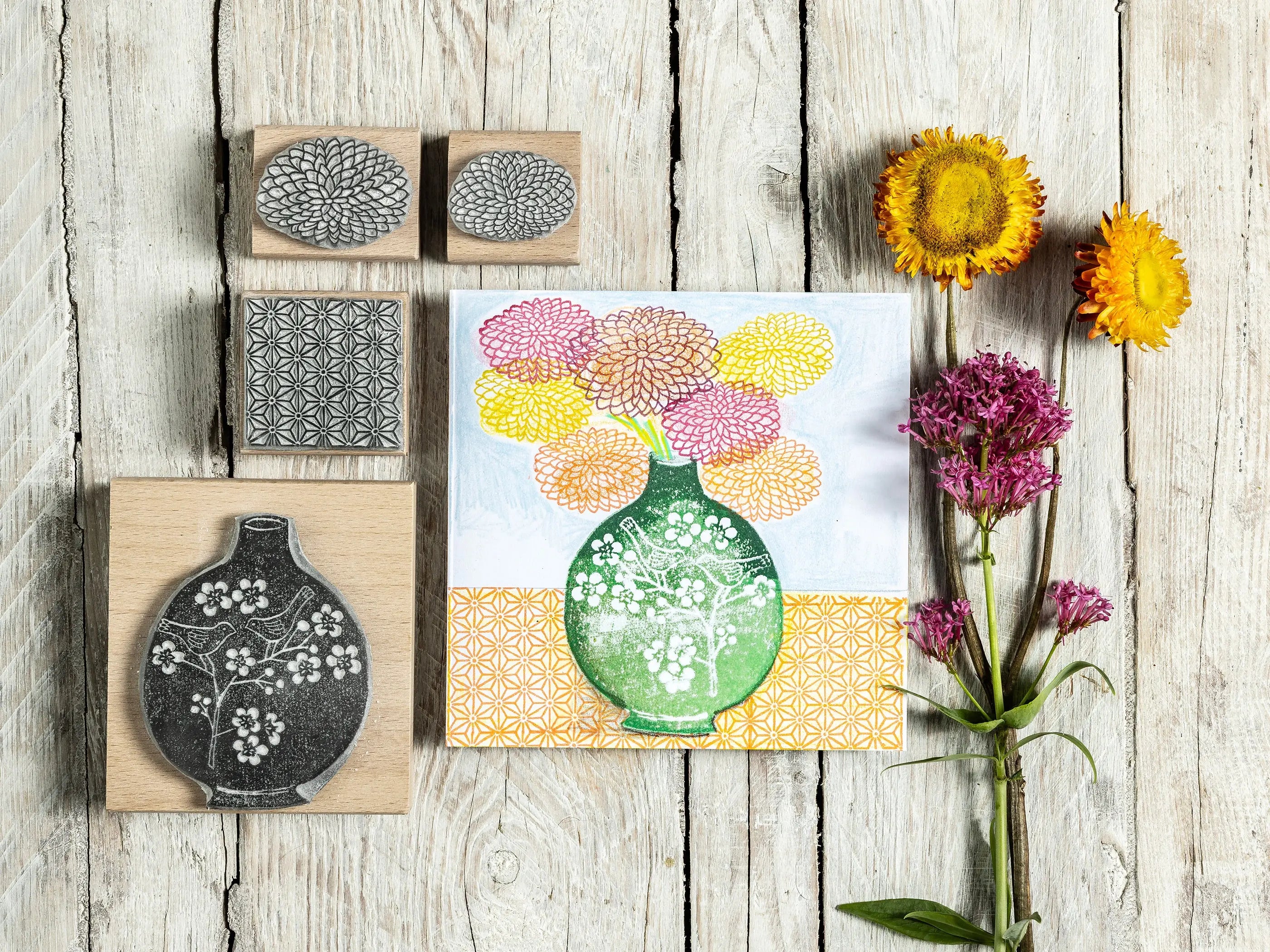 Drawing inspiration from the rich visual language of Japanese art and textiles, this collection celebrates the effortless way Japanese design mixes bold florals, intricate geometry, and natural imagery with stunning balance and grace. Whether you're making handmade cards, printing on fabric, or crafting your own wrapping paper, these stamps invite you to slow down, play, and create with intention.