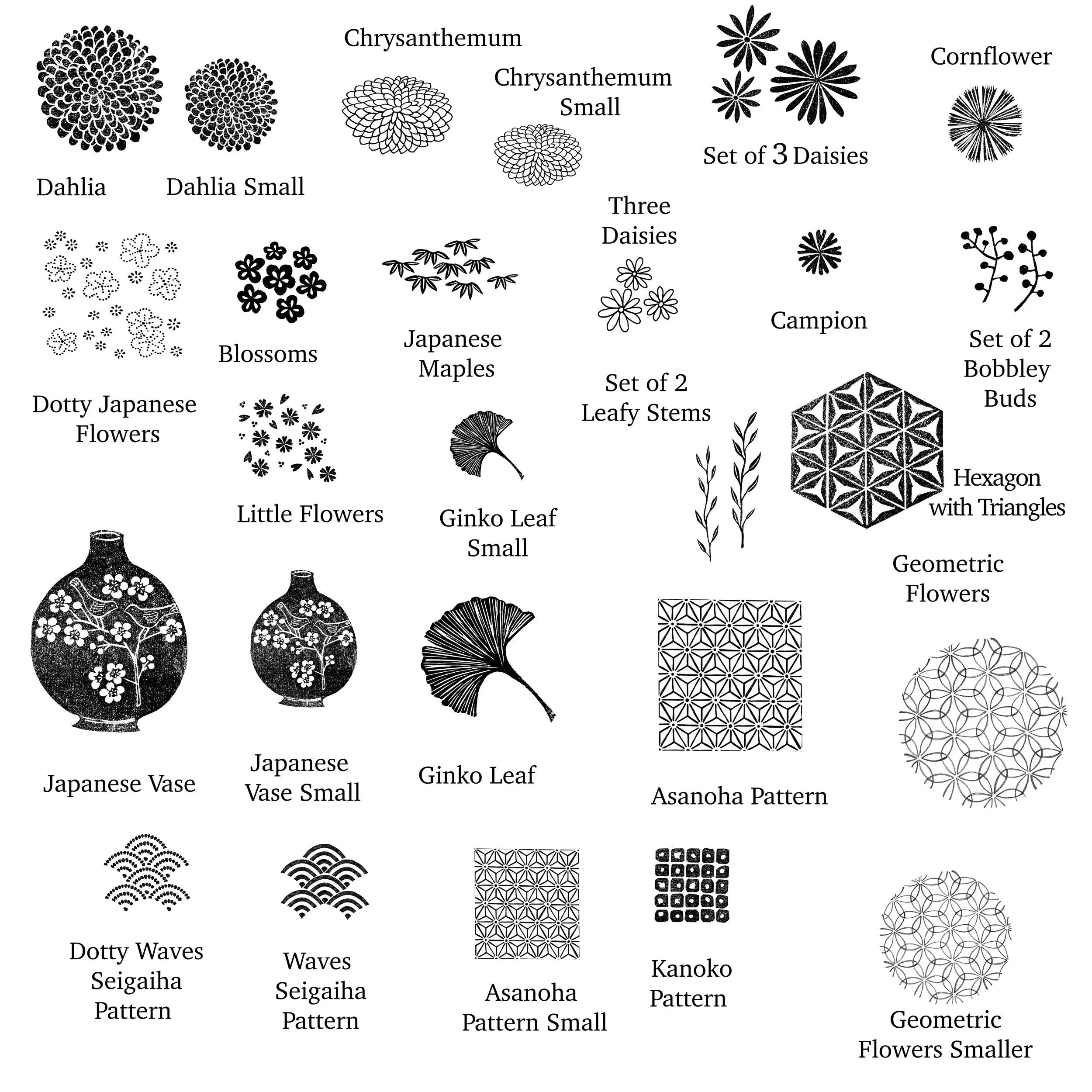 Discover the delicate beauty and timeless charm of Japanese design with this carefully curated collection of Japanese-inspired flower and pattern rubber stamps. Featuring a harmonious blend of florals, geometric motifs, and traditional textile-inspired elements, these stamps are perfect for adding a touch of elegance to your creative projects.