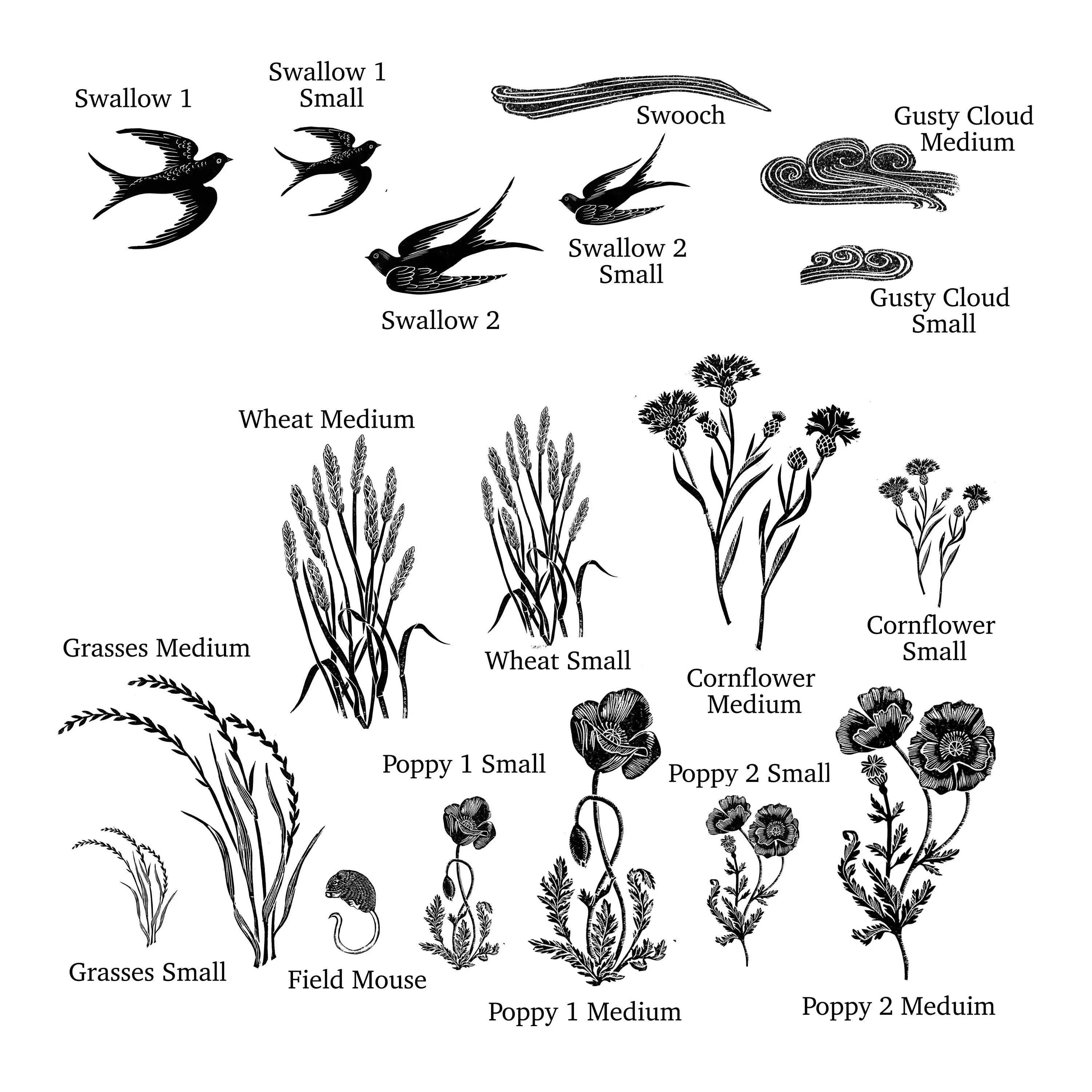 A Hot and hazy collection of Summer Meadow Rubber Stamps to make you think of a country walk on a summers day. These designs were crafted using a lino cut technique then made into rubber stamps.