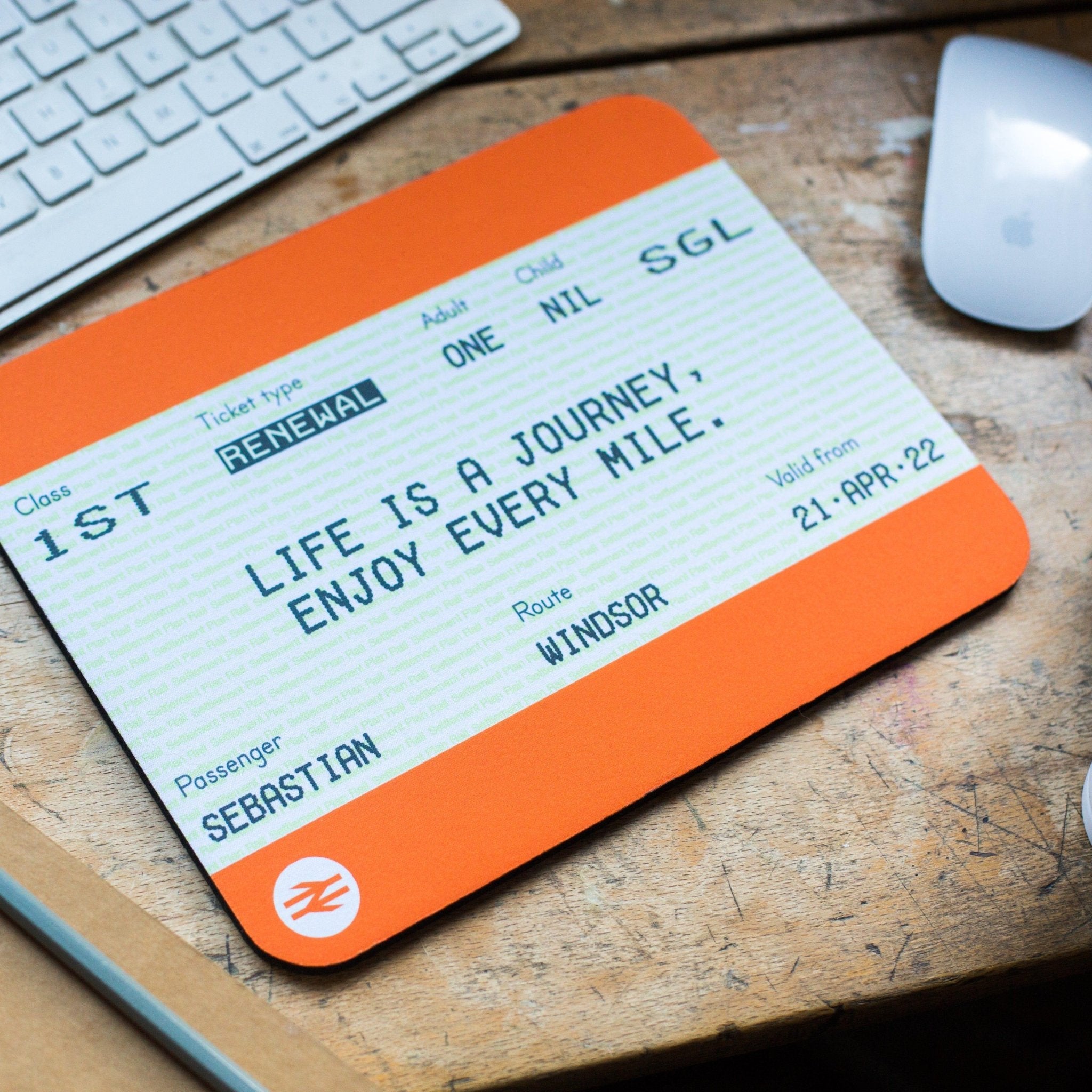 We have taken the instantly recognisable National Rail train ticket and given it a new lease of life as a personalised mouse mat, customised to celebrate a birthday!