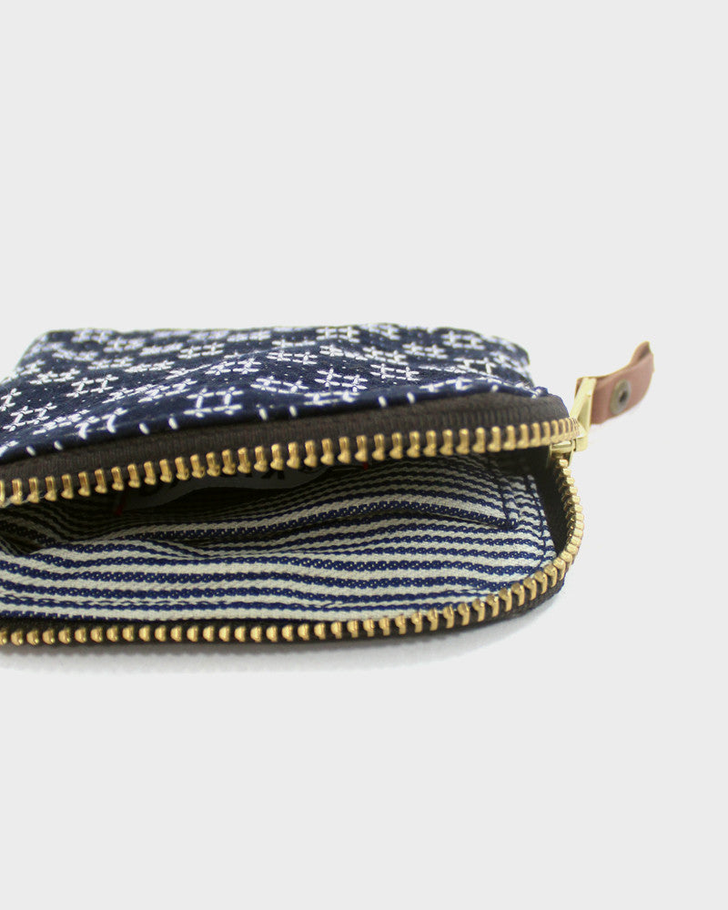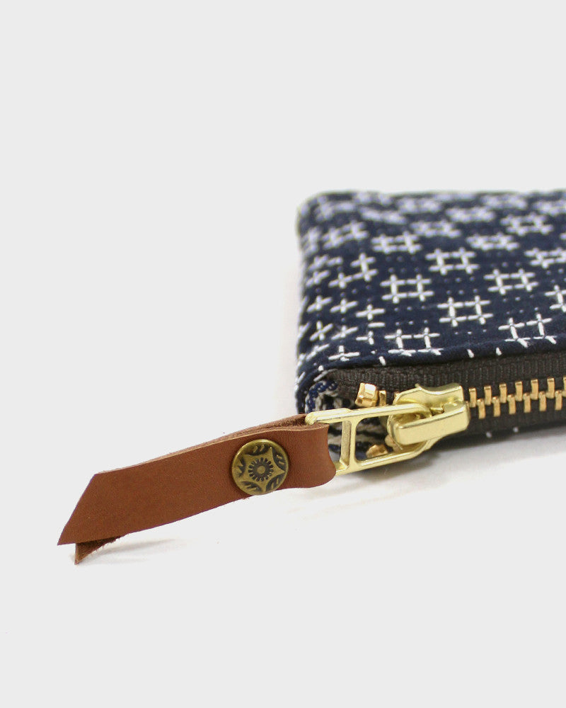 Sashiko stitching was originally done by hand not just for decoration, but also to reinforce fabric. This zipper wallet displays different sashiko patterns with a classic indigo blue base and white, undyed thread.