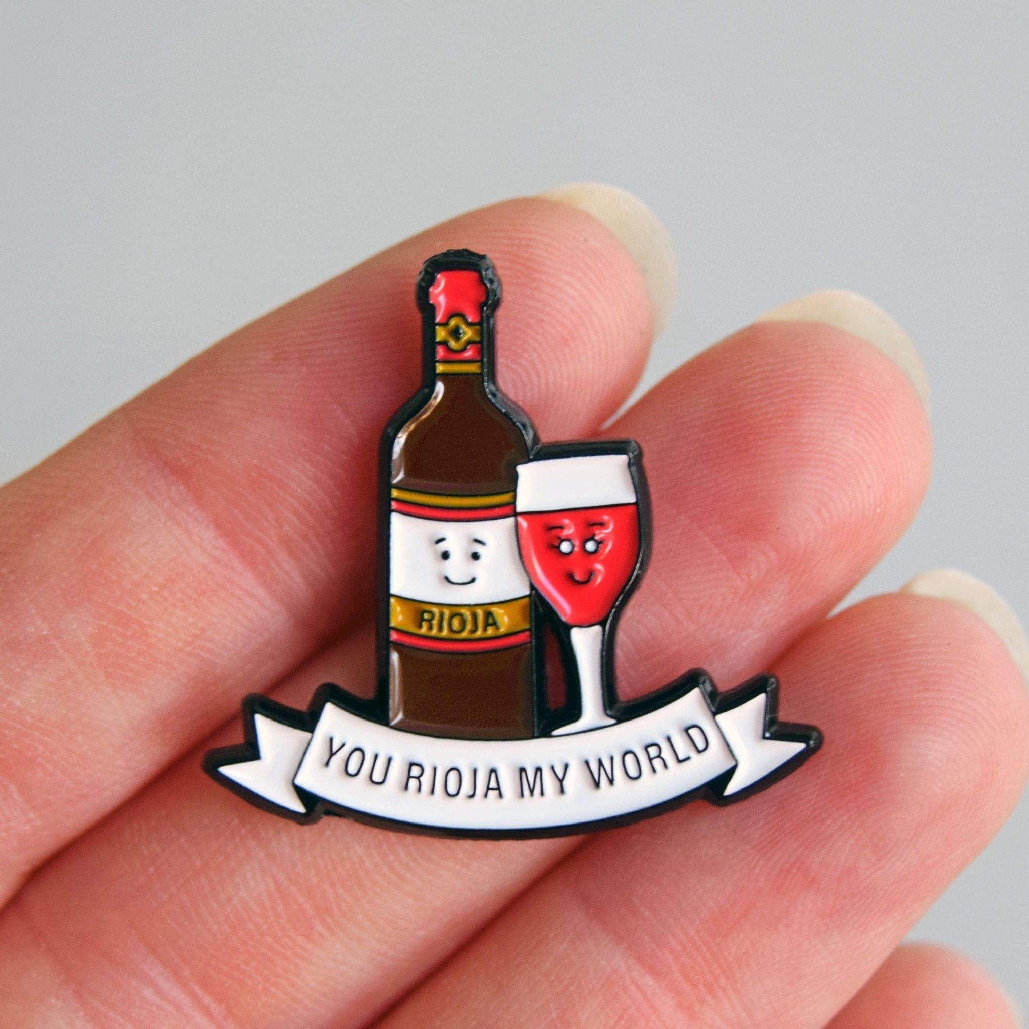 This hilarious 'You Rioja My World' enamel pin badge is the perfect way to show your wine loving friend or partner that you care. The charmingly illustrated pin badge features two adorable drawings of a bottle of Rioja and a matching glass with the pun 'You Rioja My World'.