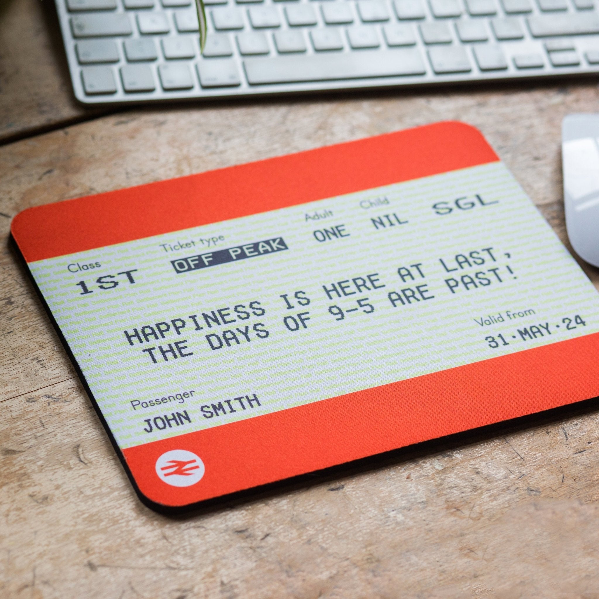 Celebrate retirement in style with our personalised National Rail ticket-inspired mouse mat. This unique and thoughtful gift is perfect for someone who's ready to trade in their 9-5 routine for the freedom and joy of retirement. The mouse mat features the funny message, 'Happiness Is Here At Last, The Days Of 9-5 Are Past!' , making it a perfect reminder of the free hours stretching ahead of them.